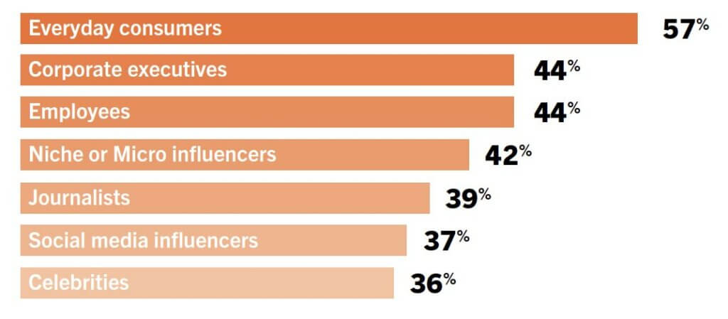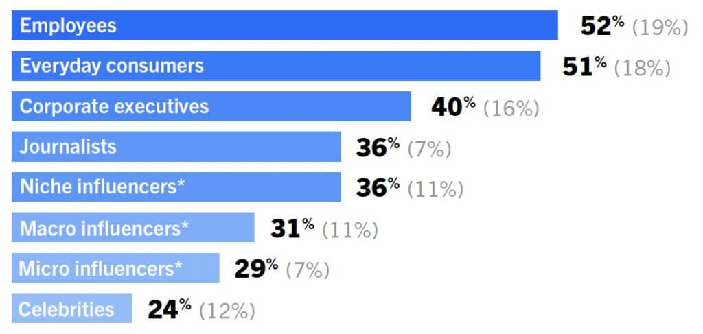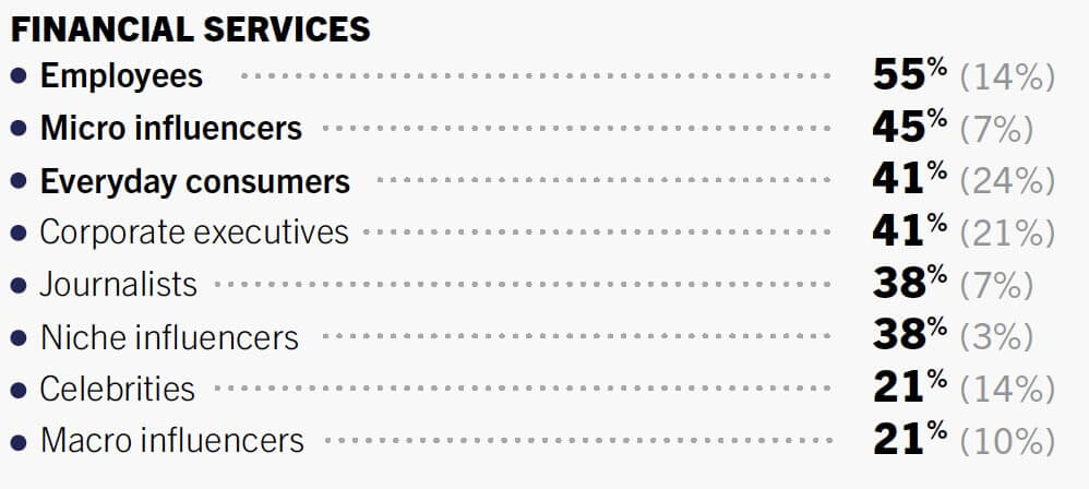 Pour la première fois en huit ans d’existence de cette étude, les employés occupent la première place parmi les influenceurs. C’est également le cas dans les secteurs des services financiers et de la santé/pharmacie. Si on y ajoute le poids des dirigeants (corporate executives), il devient encore plus évident que les collaborateurs de l’entreprise devraient être les priorités de la communication des entreprises.